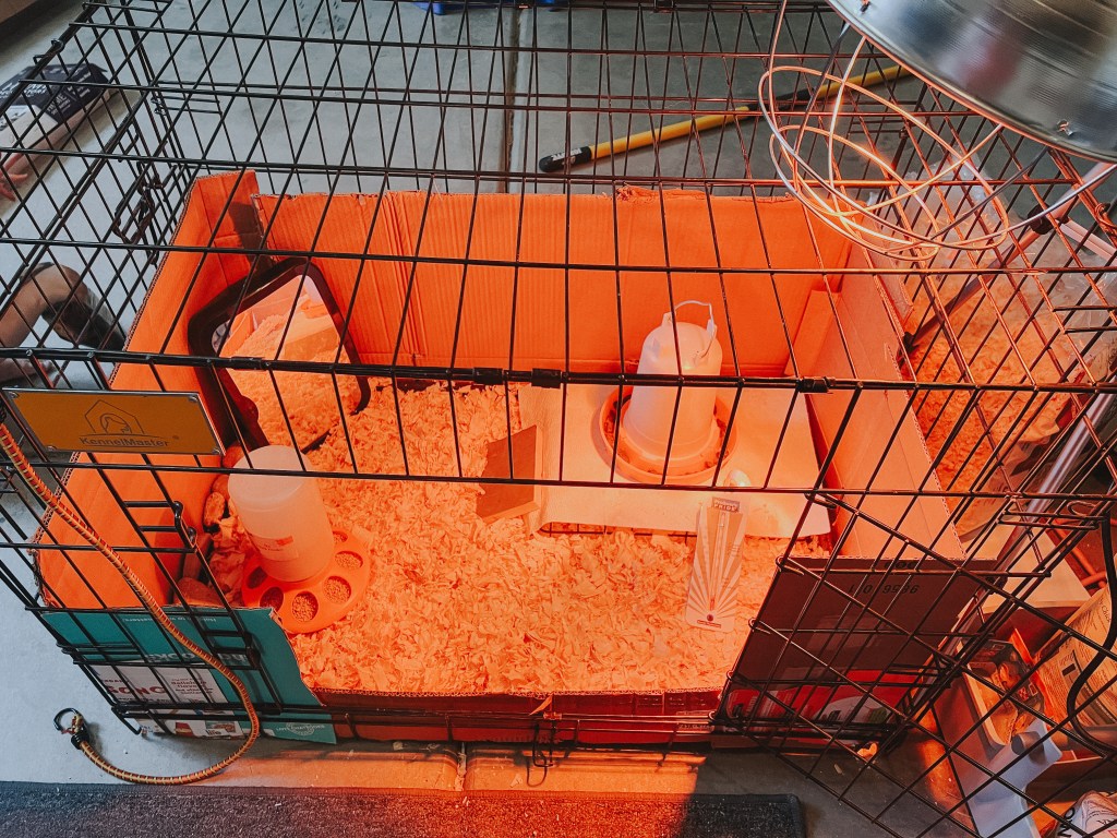 This was our brooder set up. We used Major’s old dog crate and lined it with cardboard attached via zip tie so they couldn’t slip through the cracks. It worked really well!
