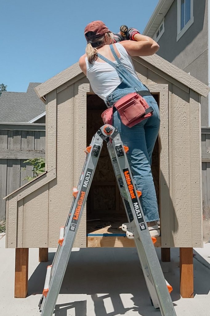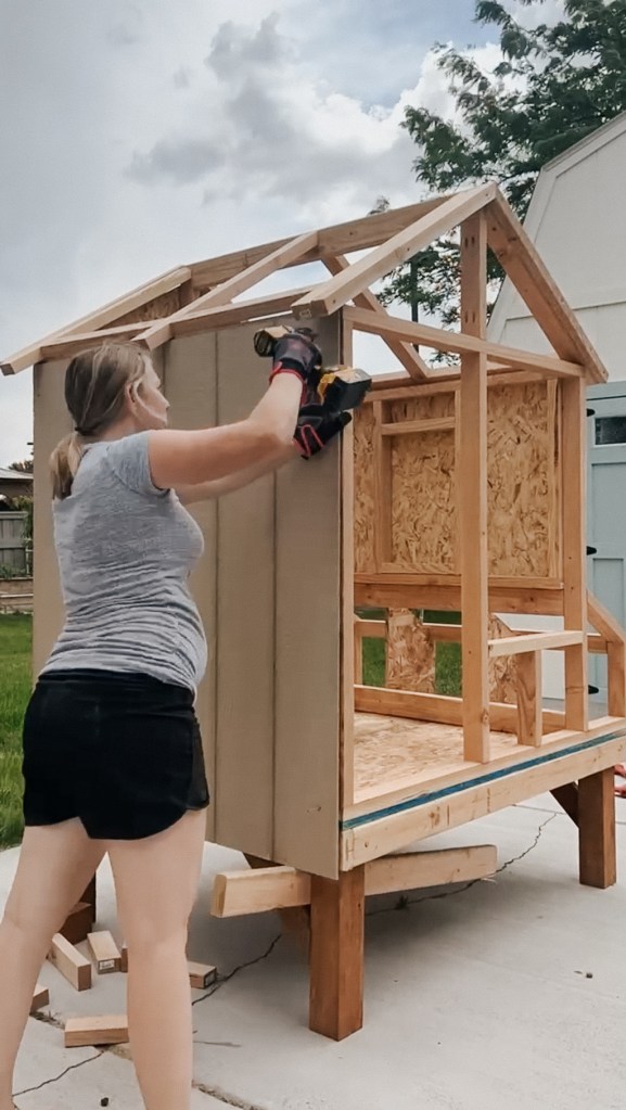 With all the framing done, it was finally time to add siding. I recommend having two people for this part. I could do some of the pieces myself, but it was so much easier to line everything up with Jordan helping hold as well.
