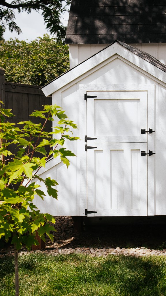 I primed everything with my favorite primer and painted it Benjamin Moore White Dove to match the shed. Make sure to use exterior paint! Using a paint sprayer makes this step so much faster. I also painted the inside to offer a layer of protection for the wood from the chickens. I painted to roosting bars Benjamin Moore Brewster Gray – I had some extra paint in that color laying around.