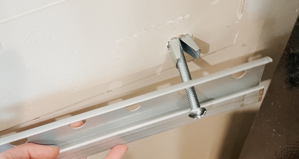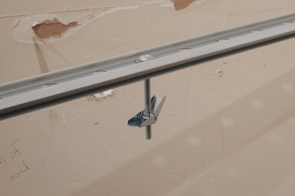 With them all built, we started hanging the suspension rails. It’s a super cool system that makes hanging them really easy – once you figure it out. The rails have holes in them so that you can easily hit studs. The recommendations are to hit every stud you can, but also to not go more than 10-12” without attaching it to a stud. Most studs are 16” apart, which makes this a little complicated. We hit all the studs we could and then in between the studs, we added these heavy duty toggle bolts.