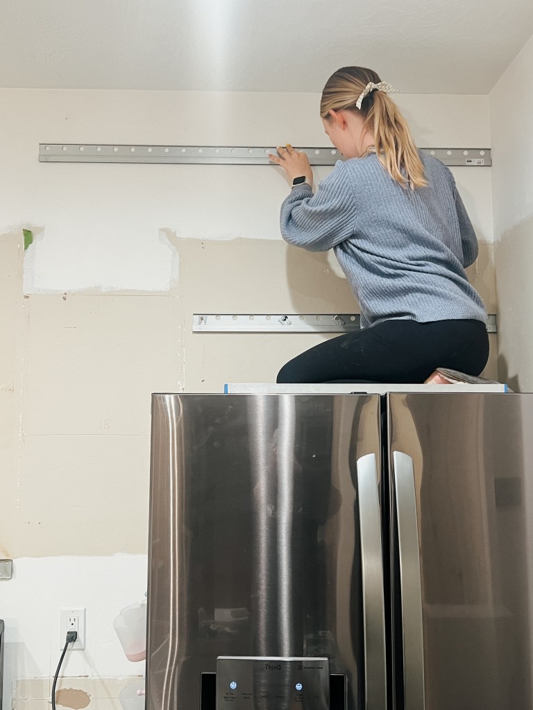 Once the rails are up, you just hang the cabinet on it and then lock it into place – super easy! The first one we hung was a little tricky because we couldn’t figure out if we were hooking it onto the rail correctly. Once we sorted that out we were golden. We hung the first layer of uppers first, then the small uppers on top of them, and then finally we did the lowers.