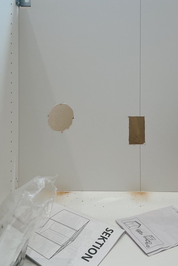You’ll need to cut out the plumbing and electrical holes in the sink cabinet. I highly recommend a multitool for this!