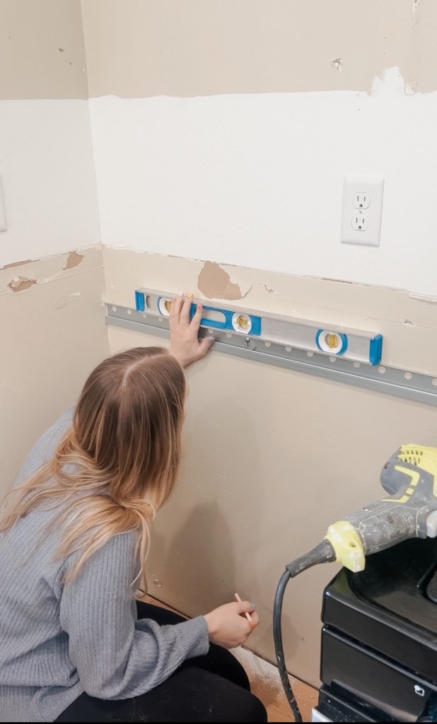 You’ll want to make sure the rail is super level and plumb to the wall, so if your wall bows in or out, use shims to correct it.