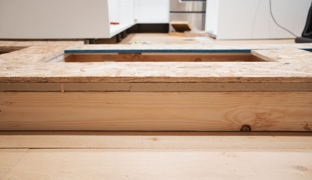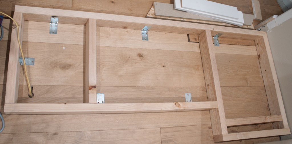 I built a ladder frame for the base of the peninsula, since of course there is no wall for a suspension rail to hang. It’s not too complicated, just some 2x4s screwed together to create a frame. I added some additional material on top (glued and nailed) to get it to match the height of the other cabinets. I screwed it into the studs of the wall and used some brackets to secure it to the floor.
