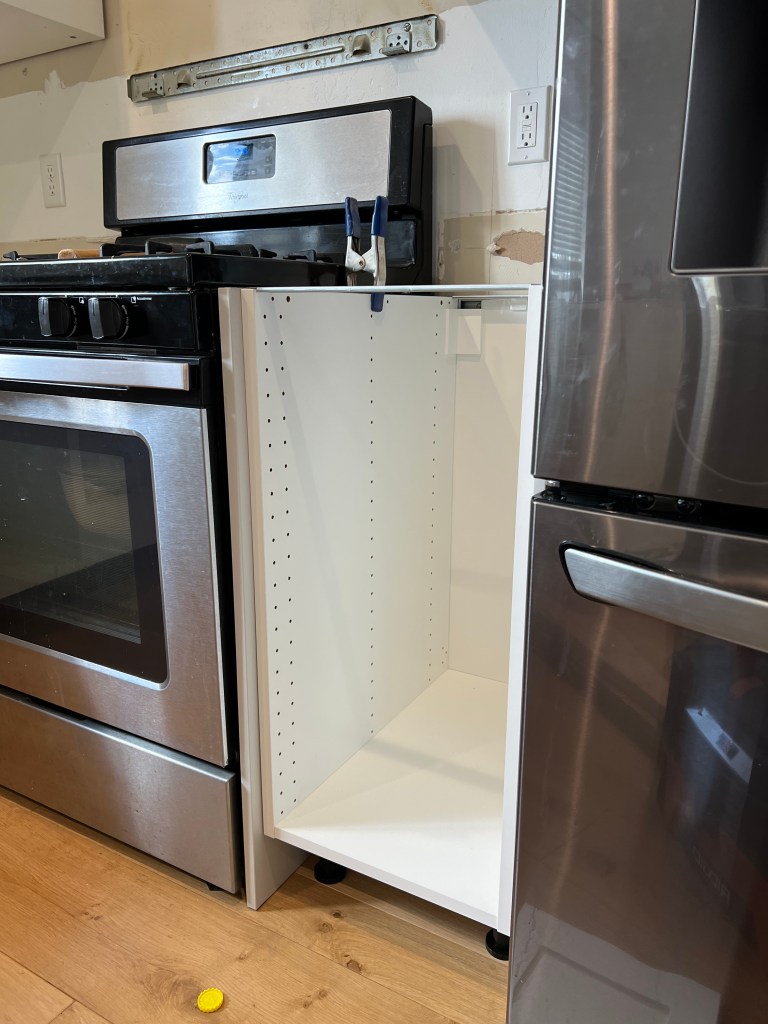 I also needed filler pieces. These go anywhere there are gaps between cabinets. I used offcuts from the end panels, so I didn’t have to paint them again. To attach these, I added blocking to the space next to the cabinet and glued the filler piece to the block. The glue will be plenty to hold it tight and I don’t have to fill any nail holes on the front.