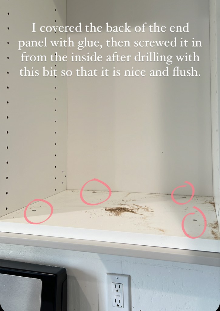 Attaching them was easy, but I was also very careful to line them up perfectly. The IKEA directions will guide you to install them flush with your cabinet box. There is nothing wrong with this approach, but it does leave your door sitting proud and I wanted the front of the end panel flush with the face of the door. I used the door sample that I have on hand (since the cabinet doors are still being made) to line it up. I covered the side with wood glue and then screwed them in from the inside. I used a countersink bit so that the screw is flush on the inside of the cabinet.