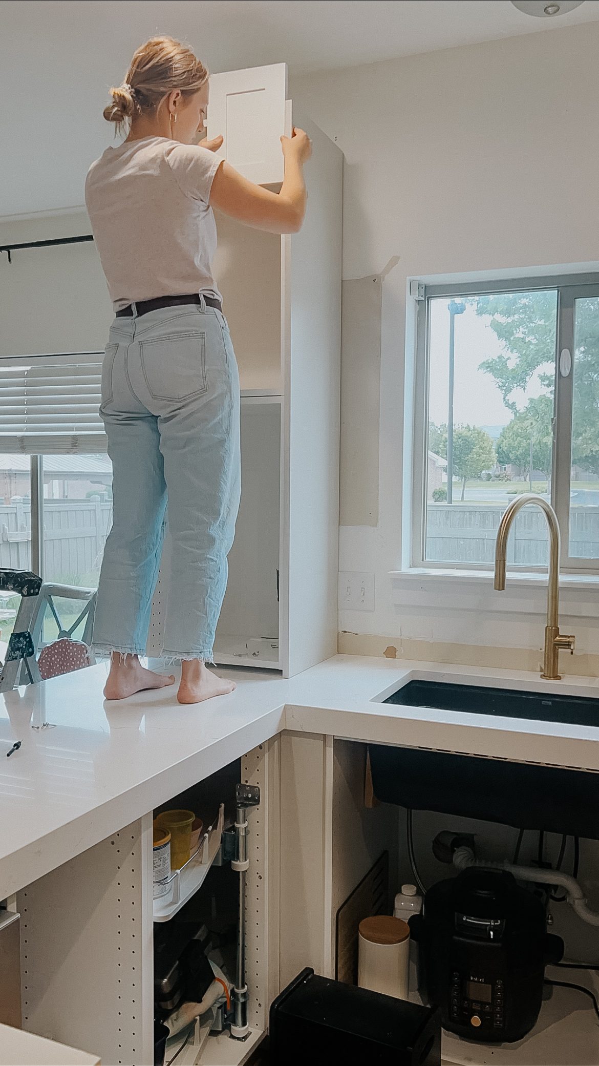 I finished the bottom filler pieces, had the countertops installed, and then did the uppers so unfortunately I don’t have a picture of them all finished at once, but hopefully you get the gist! 🙂