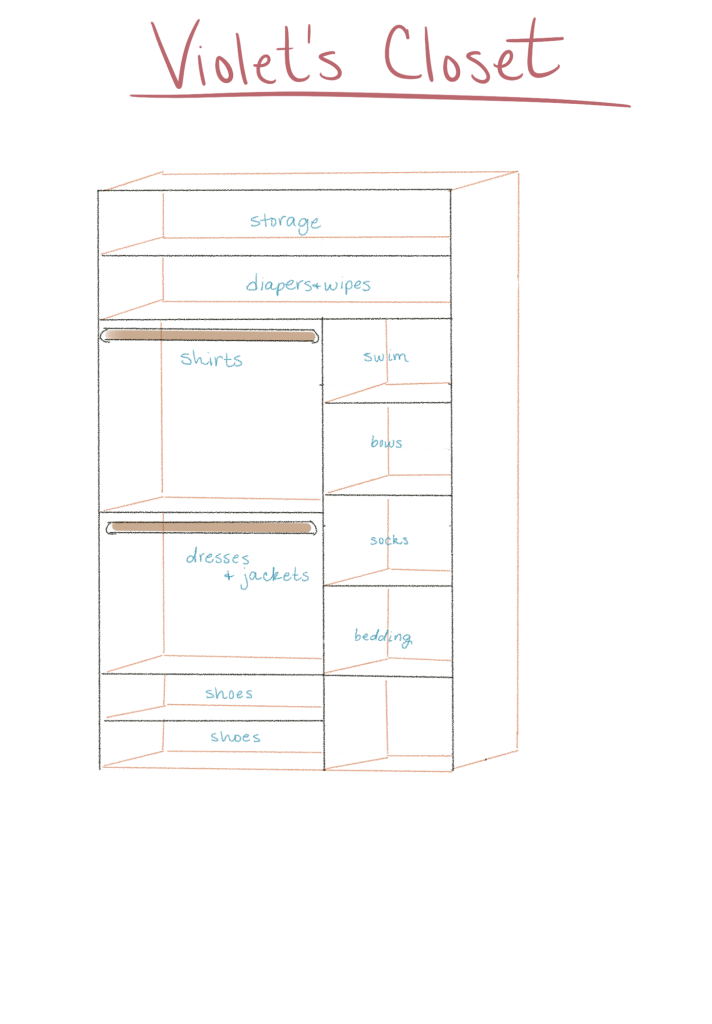 When I redid Violet’s nursery for her last winter, one of the challenges in her room was the lack of space. It is not a very big room, so I had to come up with space saving some solutions. One of the main decisions I made to conquer that issue was here, with this closet.