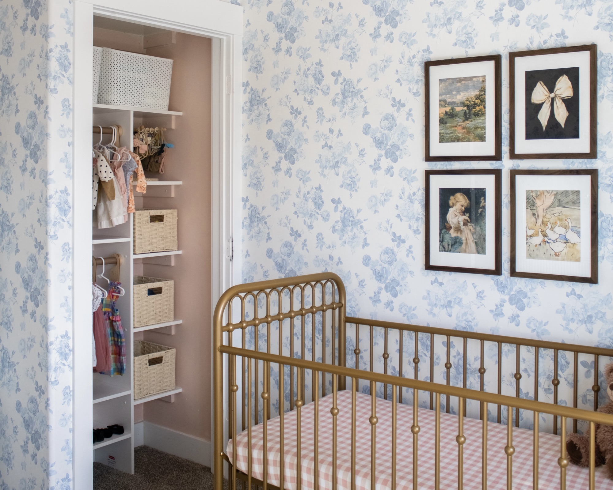 When I put the crib on this wall, I could no longer fully open the closet door, and that was true with other furniture configurations as well. I wasn’t willing to ditch the rocking chair (or any other furniture), so I decided to take the door off the closet instead! I didn’t want to stare at a boring or ugly closet, though, so I decided to make it pretty!