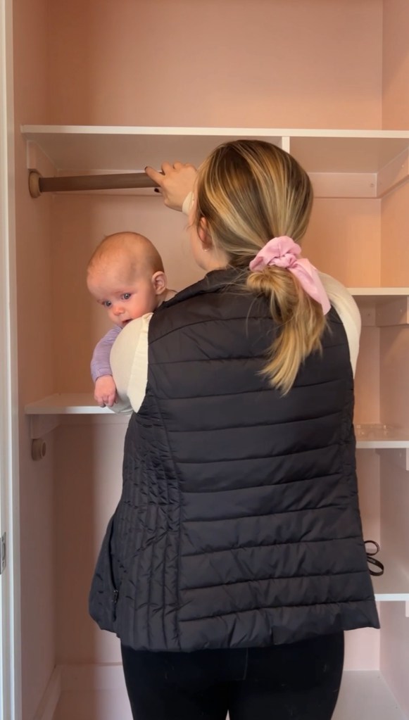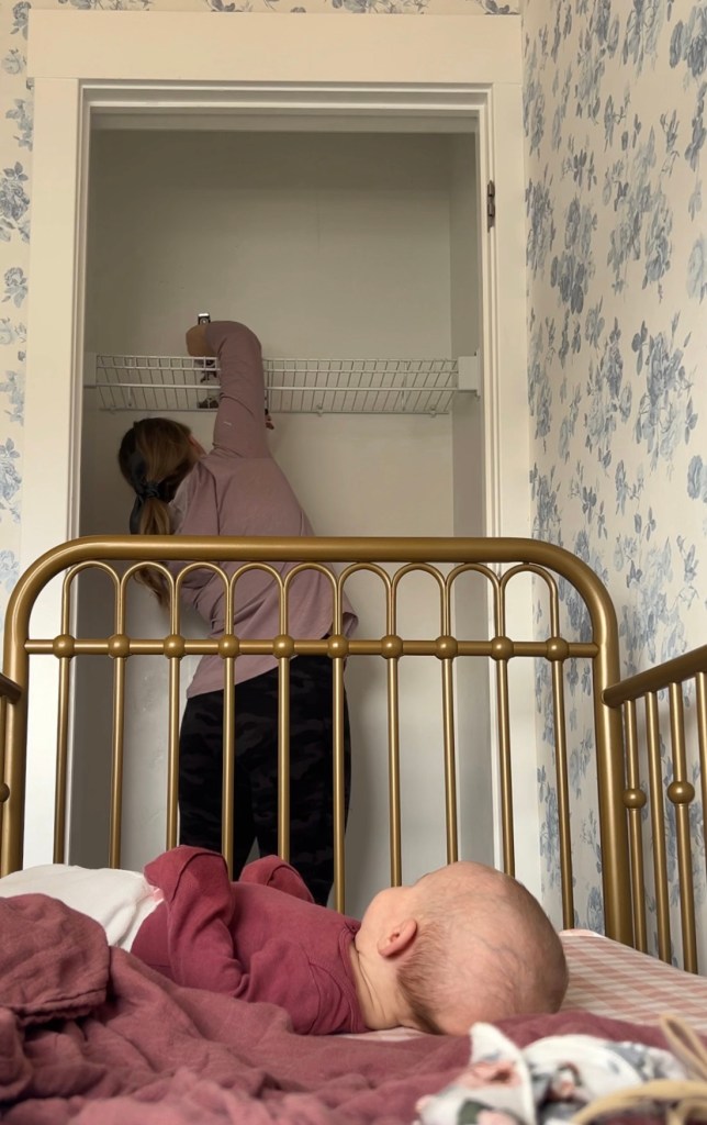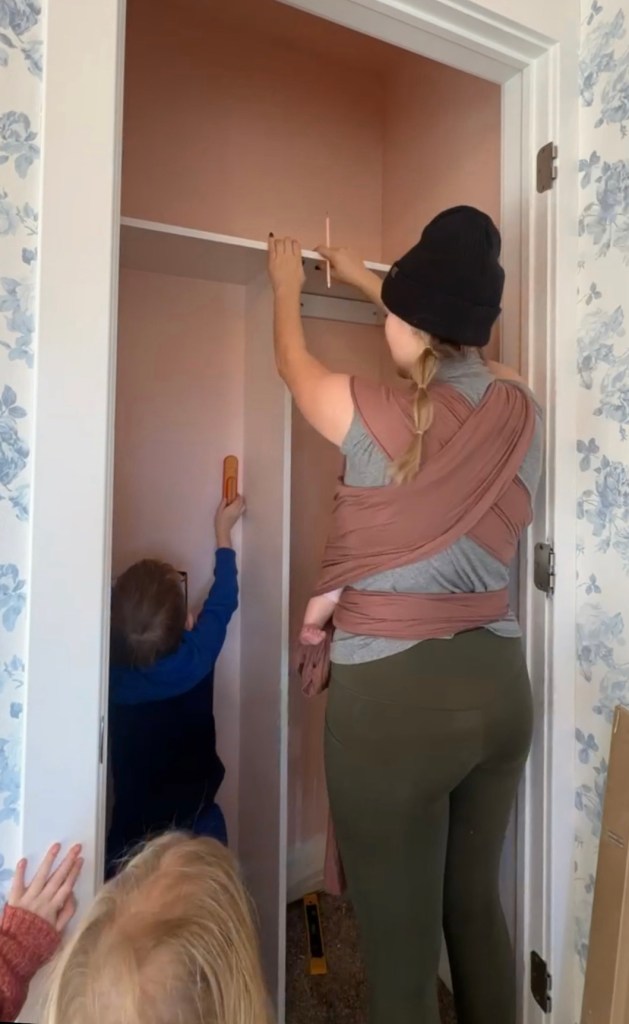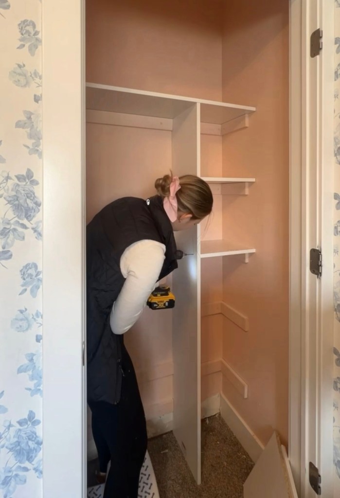 I started by removing the old wire shelving and rods, then I filled the holes left behind. I painted the whole closet, including the ceiling, pink! I had some leftover paint from her pink shiplap ceiling, so I used the same color.