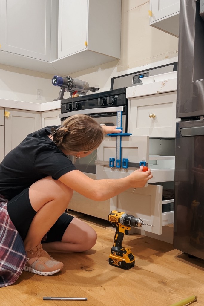 I used this new hardware jig and I really liked it! It’s fancier than anything I’ve used before and it works so well. I liked that I could set it up for all of the drawers/cabinets and then mark all of them right after another without having to measure or reset everything.