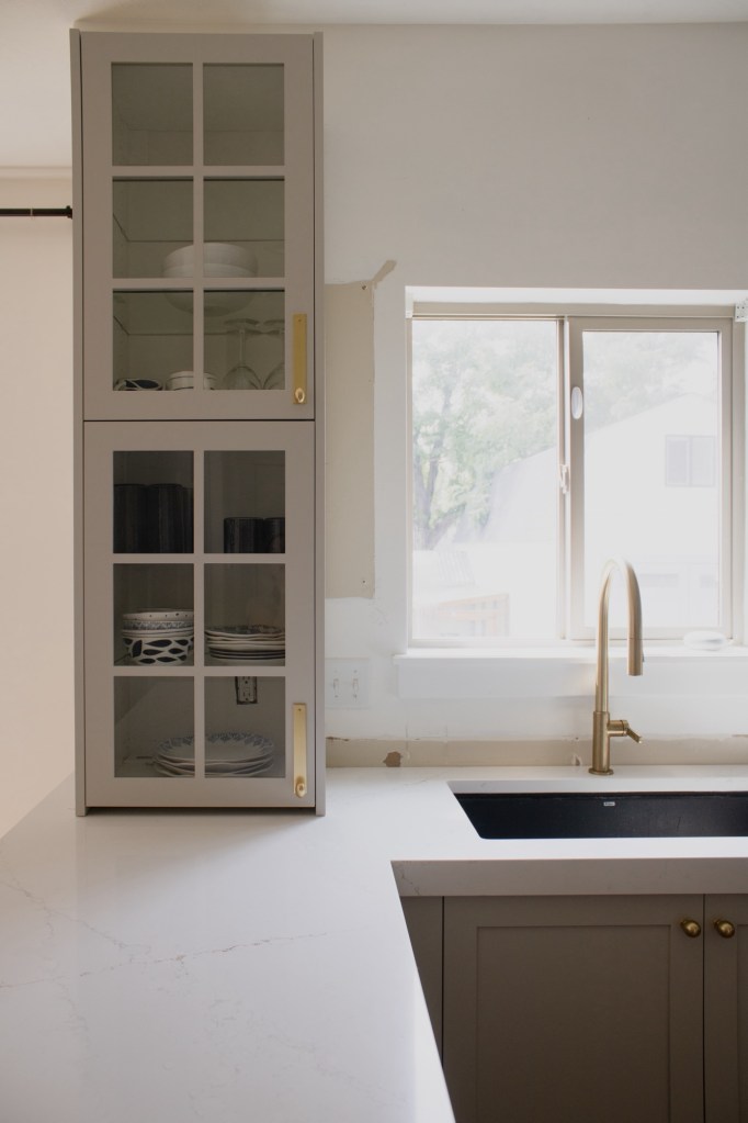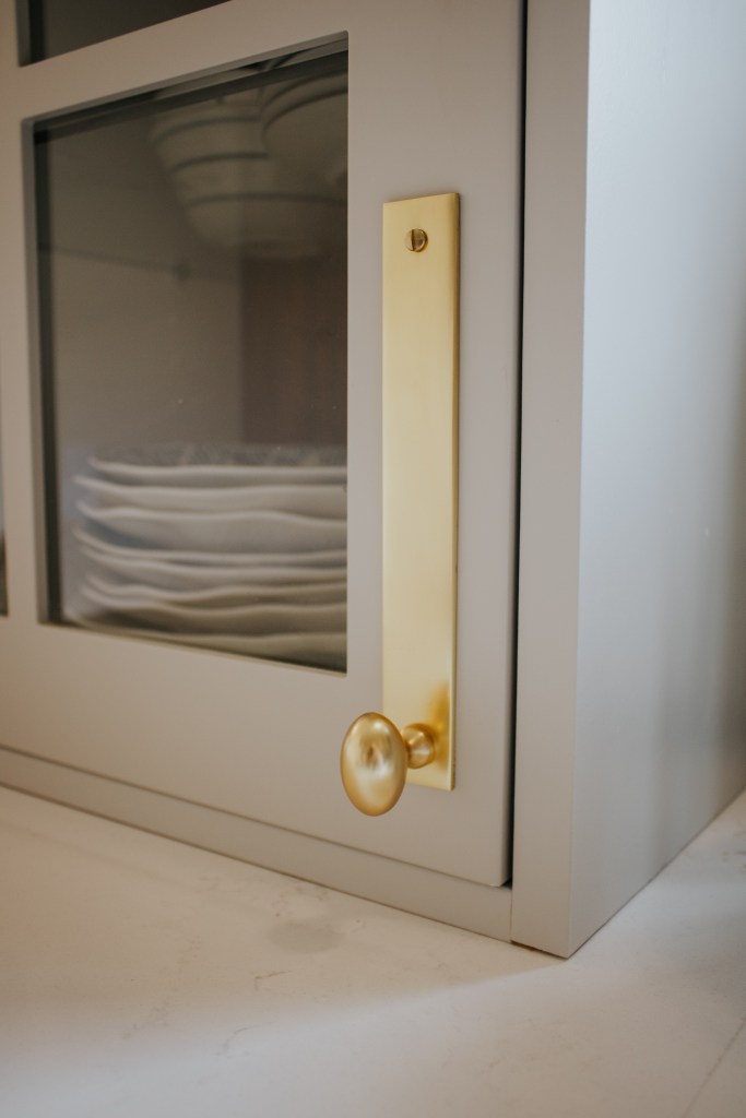 Most of the upper cabinet doors have knobs. These are beautiful and heavy weight and they add just the right amount of sophistication! I would have loved to do latch pulls on the tallest glass front cabinets, but I don’t have enough space on the cabinet cover panel to make it look nice, so I just stuck with knobs. The cabinet above the refrigerator has a lift up door, so that one got a pull instead.