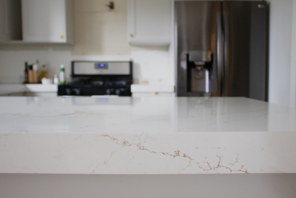Then we built and installed a ton of IKEA cabinets, focusing on the bottom first so that we could get our countertops templated and installed. I looked at way too many samples before landing on this one – Ethereal Gold Quartz. This happened mid-May, so we spent about a month and a half without a kitchen. It was brutal, I won’t lie. It was also worth it for my dream kitchen! In that month and a half, I patched the floors and built and installed the cabinets, end panels, and toe kicks.