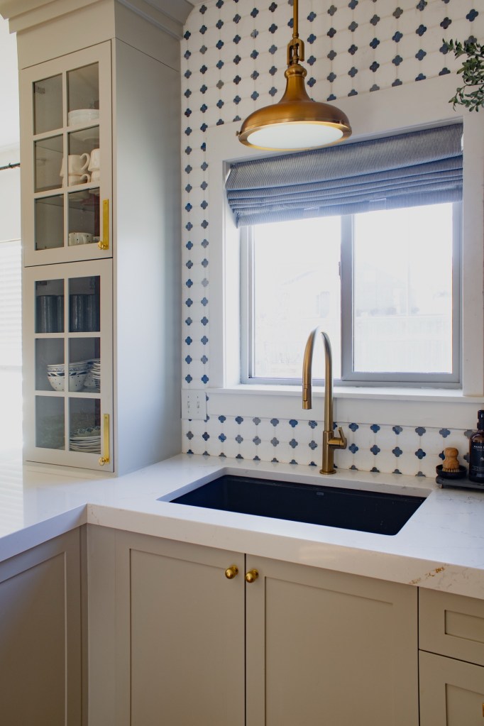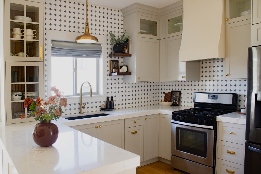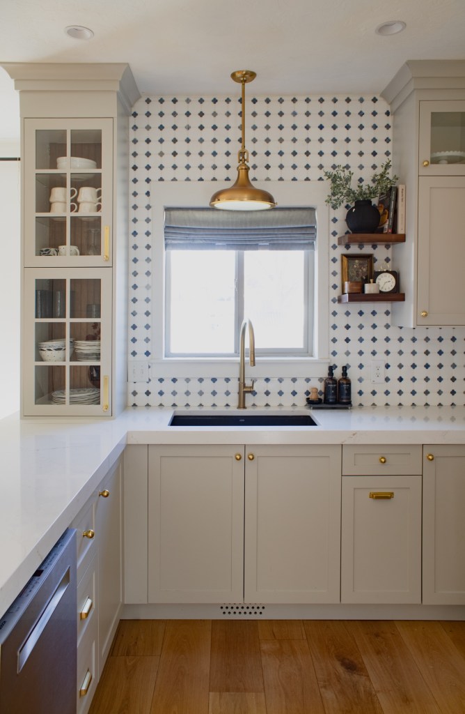 I finished the cabinets off with crown moulding to the ceiling (goodbye skyline cabinets!) and added what very well might be my favorite feature: the backsplash! I need to make an entire post dedicated to the backsplash because it is stunning. I also built out the hood vent, another thing I once only ever dreamed of and added a few floating shelves to warm things up.