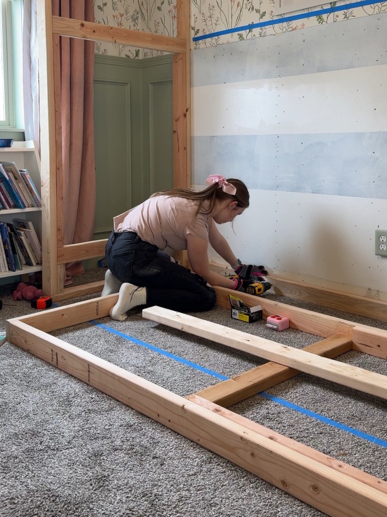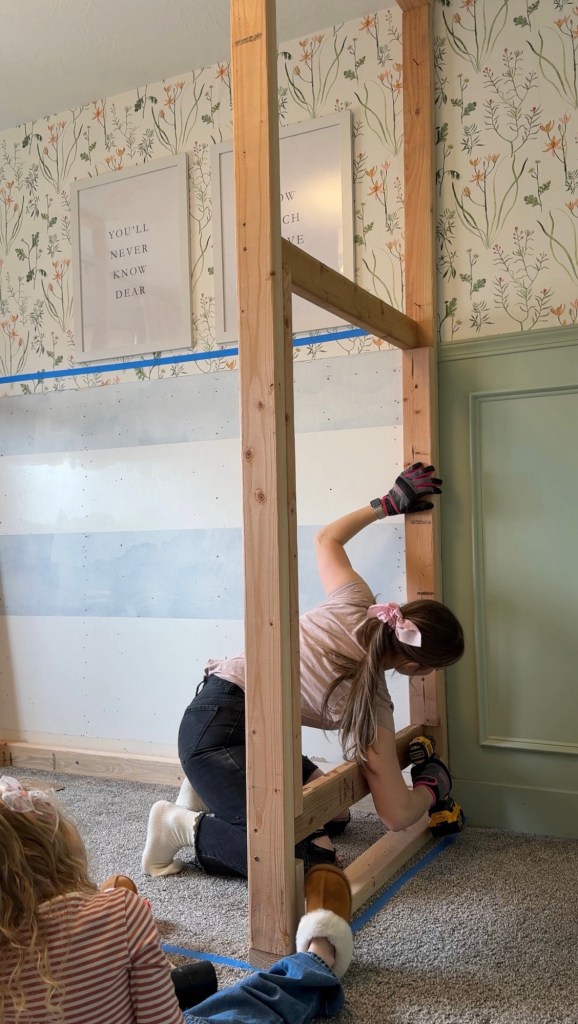 I doubled up the horizontal 2x4s with 2x3s to add a bit more support for the plywood base to sit on. Since bunks mean a child sleeping on top of another child, it is super important to me that these are incredibly sturdy. I added these with screws and wood glue because it felt like that would be sturdy. I don’t know that the wood glue was actually necessary here, but it doesn’t hurt!
