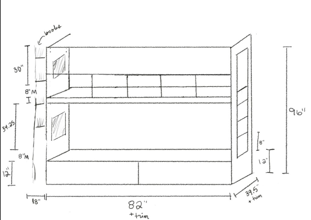 If you’ve read my plans for Theia’s bedroom, you know that I’ve been planning on these bunk beds for a while now. My kids (6yo and almost 4yo) love having sleep overs together so while we are lucky enough for them to be able to have their own rooms, giving them an easy way to make those memories together is a dream.