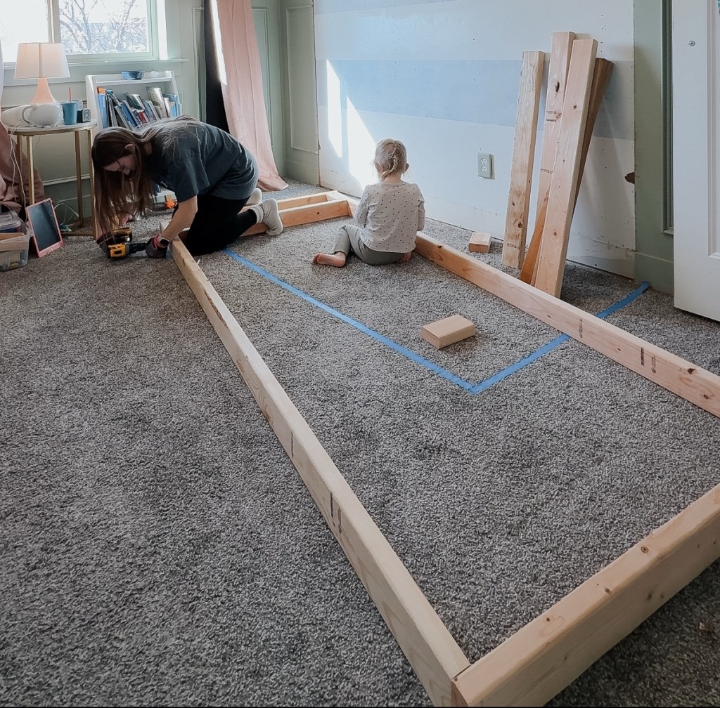 I started by building the headboard and footboard walls. I built the basic frame and didn’t attach the studs here yet. Why? Mostly because my brain was working through the build as I was going. I wasn’t exactly sure what spacing I wanted for the ladder or the cubbies (which I’ve actually nixed now). It is likely a little easier to attach the studs for these walls when you’re building the wall so while that isn’t what I did, it is what I would recommend.