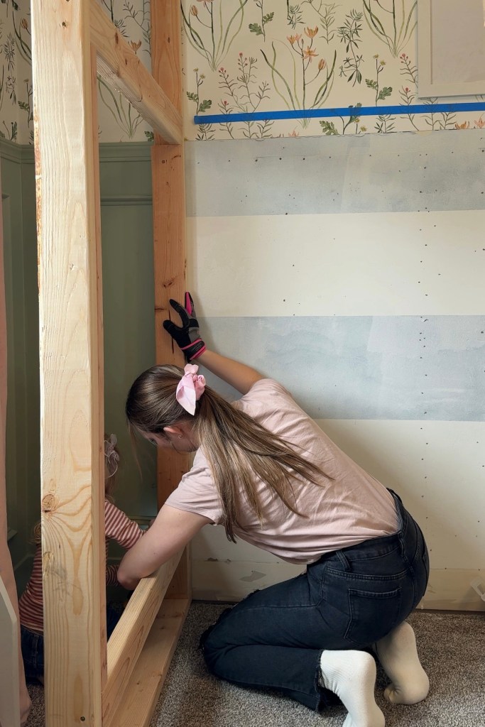 Figuring out where I wanted the height of the second level to sit was actually a really hard decision. I landed on leaving 30” space above the mattress, which meant installing that support board 43” above the bottom one. The bottom bunk gets 34.25” of headroom after I add the 8” mattress and like I said, the top bunk will get 30”. This is unbalanced, but since the top bunk is going to be used just for fun sleepovers, I was able to leave plenty of space for an adult to sit up on the bottom and also discourage too much rough play on the top.