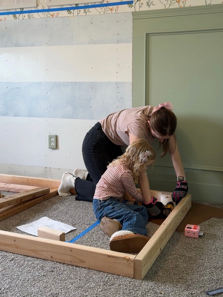 Anyway, I built the basic wall structure with the help of Miss Theia herself and we stood it up and attached it to the wall. The wall doesn’t hit any studs here, so I just threw some screws into the drywall for a bit of stability.