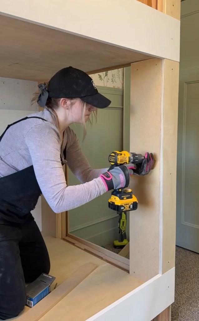 I started with the bottom piece of the top bunk. I honestly have no idea how I managed to wedge this in here in a way that allowed my to attach it myself, it should definitely be a two person job! Not necessarily because it’s heavy – because it’s not – just because it is big and awkward to hold. I used my nail gun to attach it to the framing.