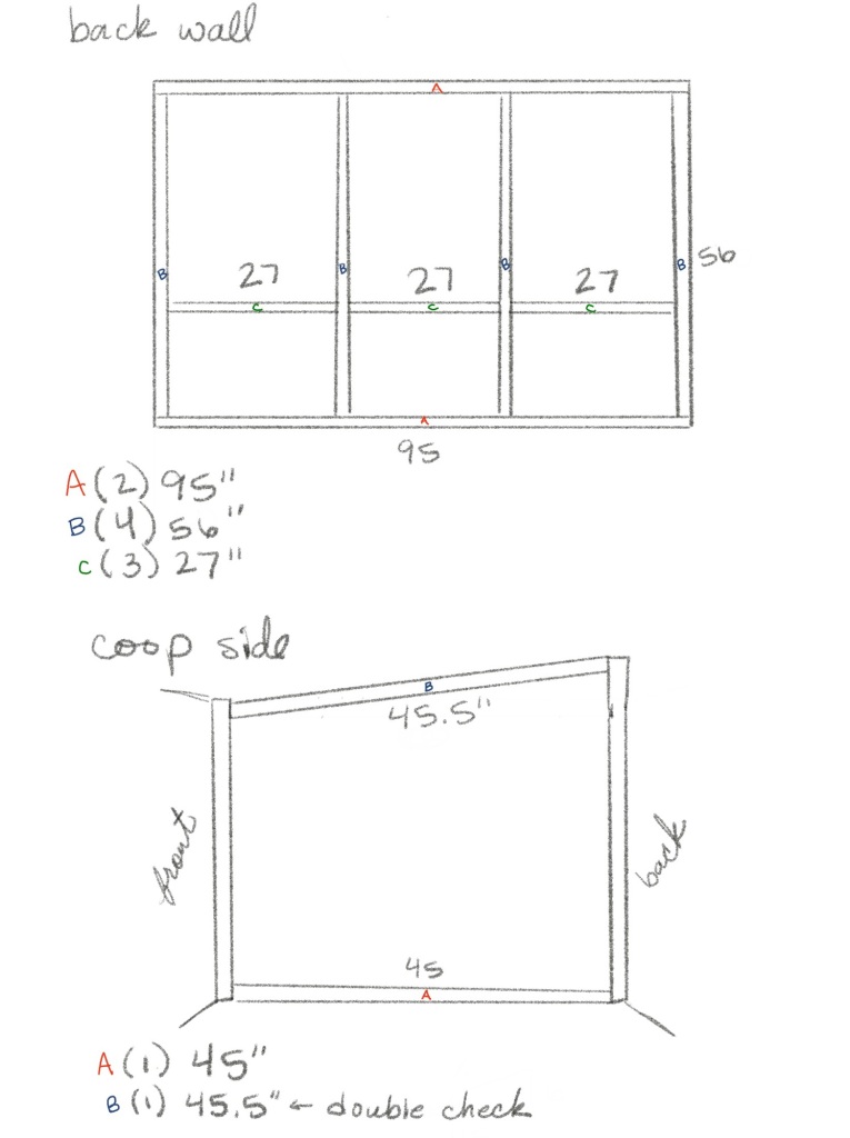 There are basically three walls in this run : the tall back wall, the shorter front wall, and the door wall. The fourth wall (opposite the door) attaches to the coop, so it doesn’t need much additional construction.