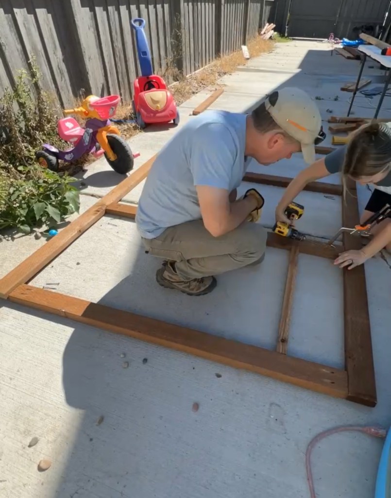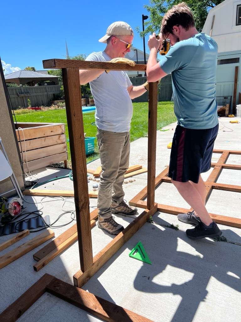 We started by building the tallest wall, then the shorter wall. We used a combination of pocket holes and regular butt joints to attach everything. We built it laying flat to keep it square.