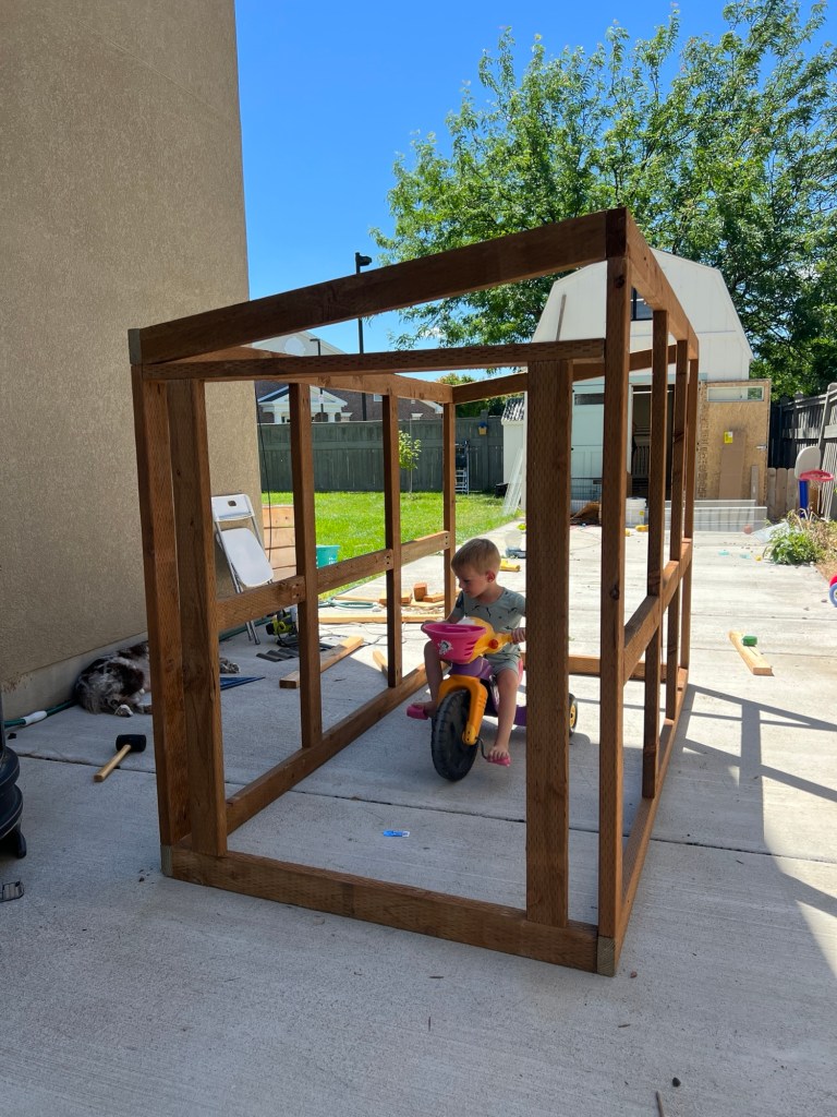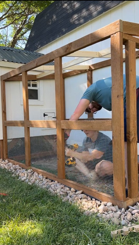 I was pregnant with my third baby when we got chickens. After I built the coop but before I built the run, I was put on modified bed rest. The chickens needed a run, so thankfully Jordan and my father in law stepped in to help. I sat on a chair and directed them in the build, and it turned out great!